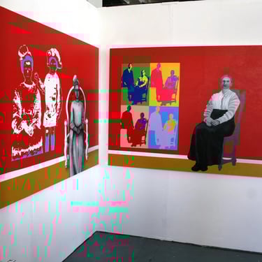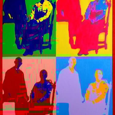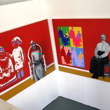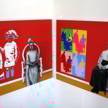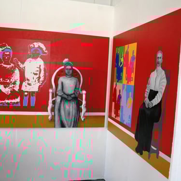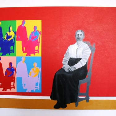 I painted the photographs in a Pop-Art style to mark the time – the middle of the XXth century (also the painting with the girl’s figure has just one image of three colours while the painting with the woman’s figure has four multicoloured images of the photograph. This is because a mother’s memories of her son would be much more multifaceted and bright than the memory of the child-sister, who would remember just one scene with her brother from childhood). The figures on the paintings are meant to be mother and daughter – the ghosts who were still visiting their ex-house at our time (where their subsequent descendants are still living, the reference to that is that the ‘Pop-art style prints’ of old photographs are hung on the walls of the house). The Ghosts (figures depicted in black and white) appears next to the ‘prints’ on the walls as they still remember their loss of brother and son. The subject-matter of the Diptych will reach a broad audience as I believe it is does not matter that people rich or poor, whether they are from England or Russia, etc. but the tragedy of the loss and the feelings about it are always the same.
